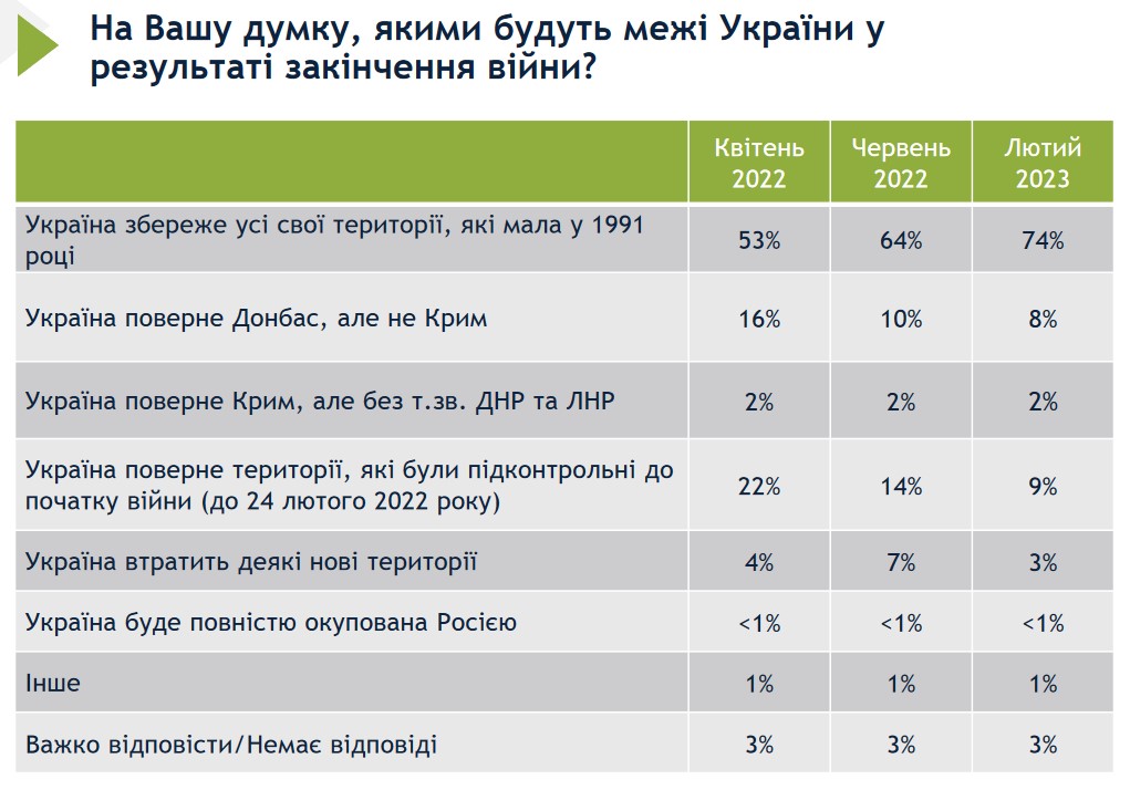 74% украинцев считают, что Украина сохранит все территории в пределах своих международно-признанных границ по состоянию на 1991 год.