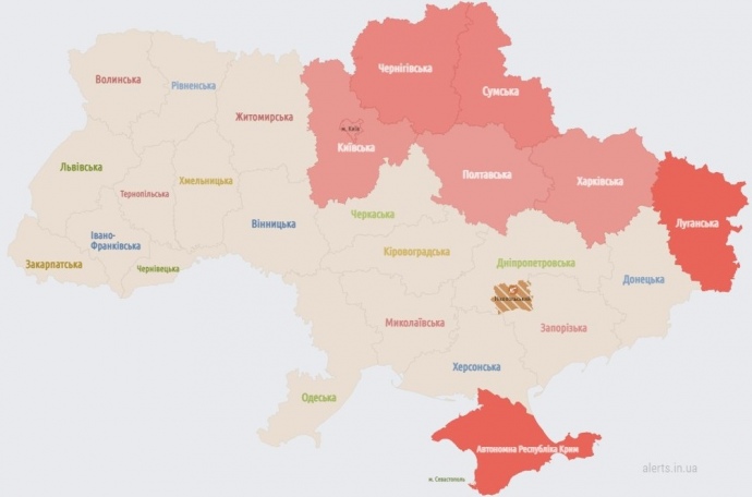 После объявления воздушной тревоги в нескольких областях, Киевская ОВА сообщила об угрозе атаки вражескими дронами.