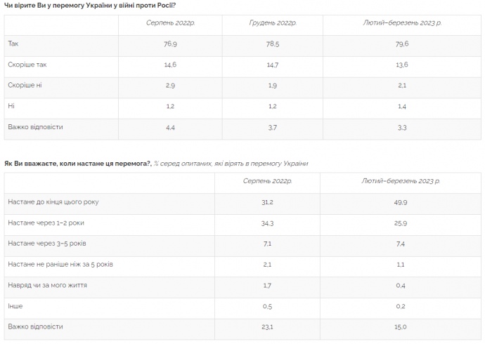 Среди тех, кто верит в победу Украины, 50% считают, что эта победа наступит до конца 2023 года, 26% - что она состоится через 1-2 года, 7% - через 3-5 лет, 1% - не ранее чем через 5 лет, и 0,4% - что она вряд ли наступит при их жизни".