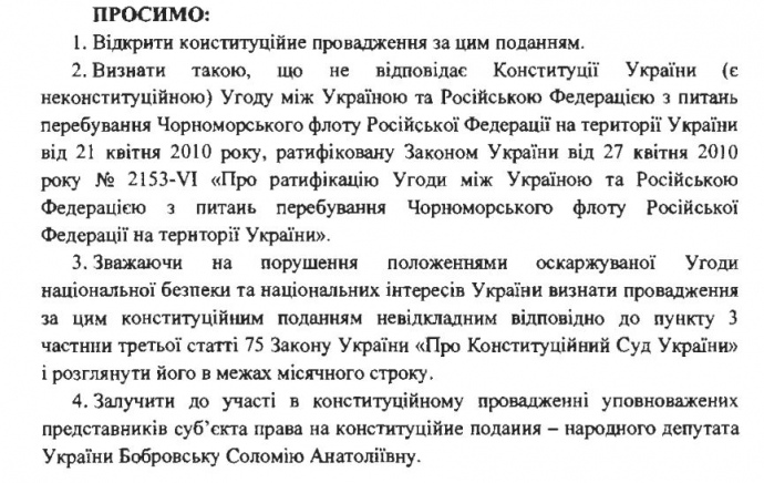 Нардепы считают, что Харьковские соглашения не соответствуют ч.7 ст. 17 Конституции и утверждают, что это соглашение противоречит принципам обеспечения нацбезопасности и призывают признать его неконституционным.