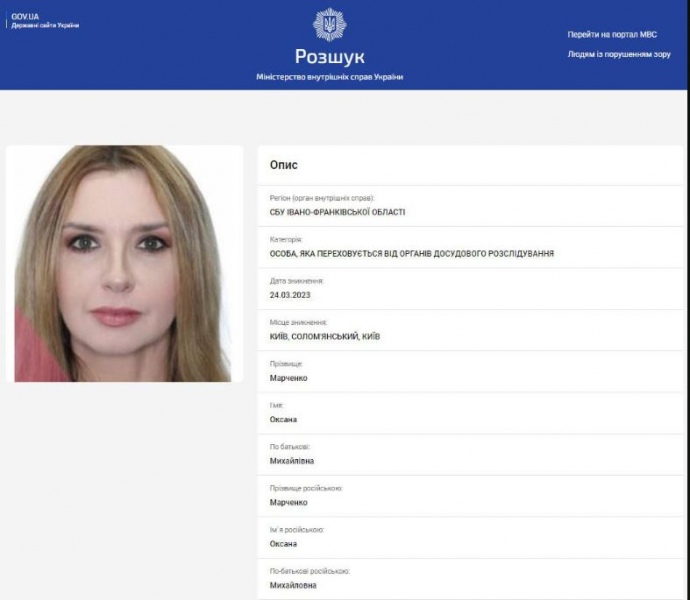 Детали: Марченко объявило в розыск главное управление СБУ в Ивано-Франковской области.