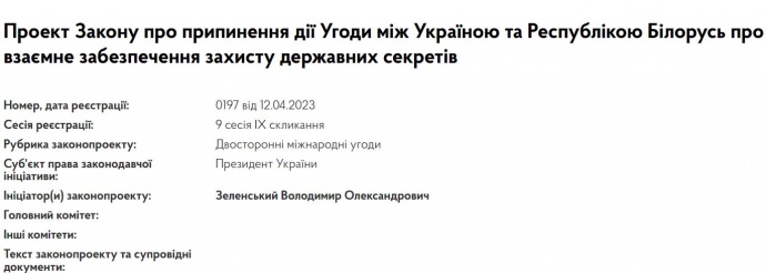 Президент Владимир Зеленский внес в Верховную Раду законопроект о прекращении действия соглашения с Беларусью о взаимной защите госсекретов.