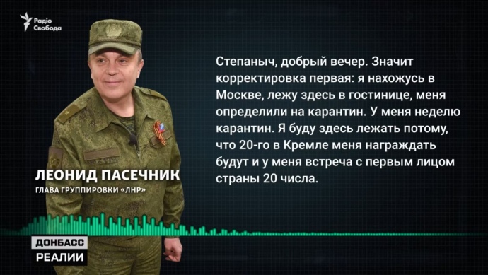 Детали: О пребывании на карантине Пасечник рассказал своему помощнику Александру Сороке, который, по данным источников, является бывшим сотрудником Главного управления Генштаба вооруженных сил РФ.