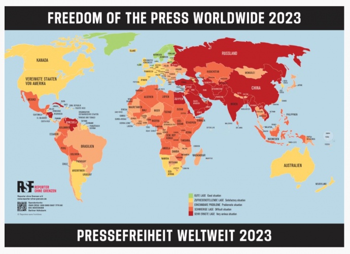 По шкале RSF, ситуация со свободой прессы является "очень серьезной" в 31 стране, "сложной" - в 42, в 55 существуют "проблемы, которые можно идентифицировать", а в 52 ситуация является "хорошей" или "удовлетворительной".