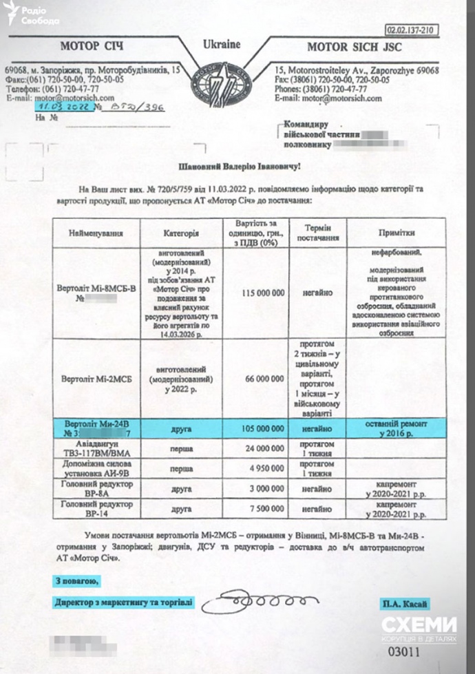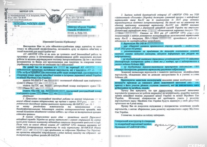 "Схемы" также приводят документы, свидетельствующие о том, что Богуслаев пытался продать ВСУ ряд вертолетов, по меньшей мере на одном из которых, летать было "рискованно для жизни".