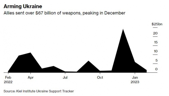 Трекер поддержки Украины от Кильского института подсчитал, что с февраля 2022 года союзники отправили Украине вооружений на сумму более 67 миллиардов долларов, пик пришелся на декабрь.