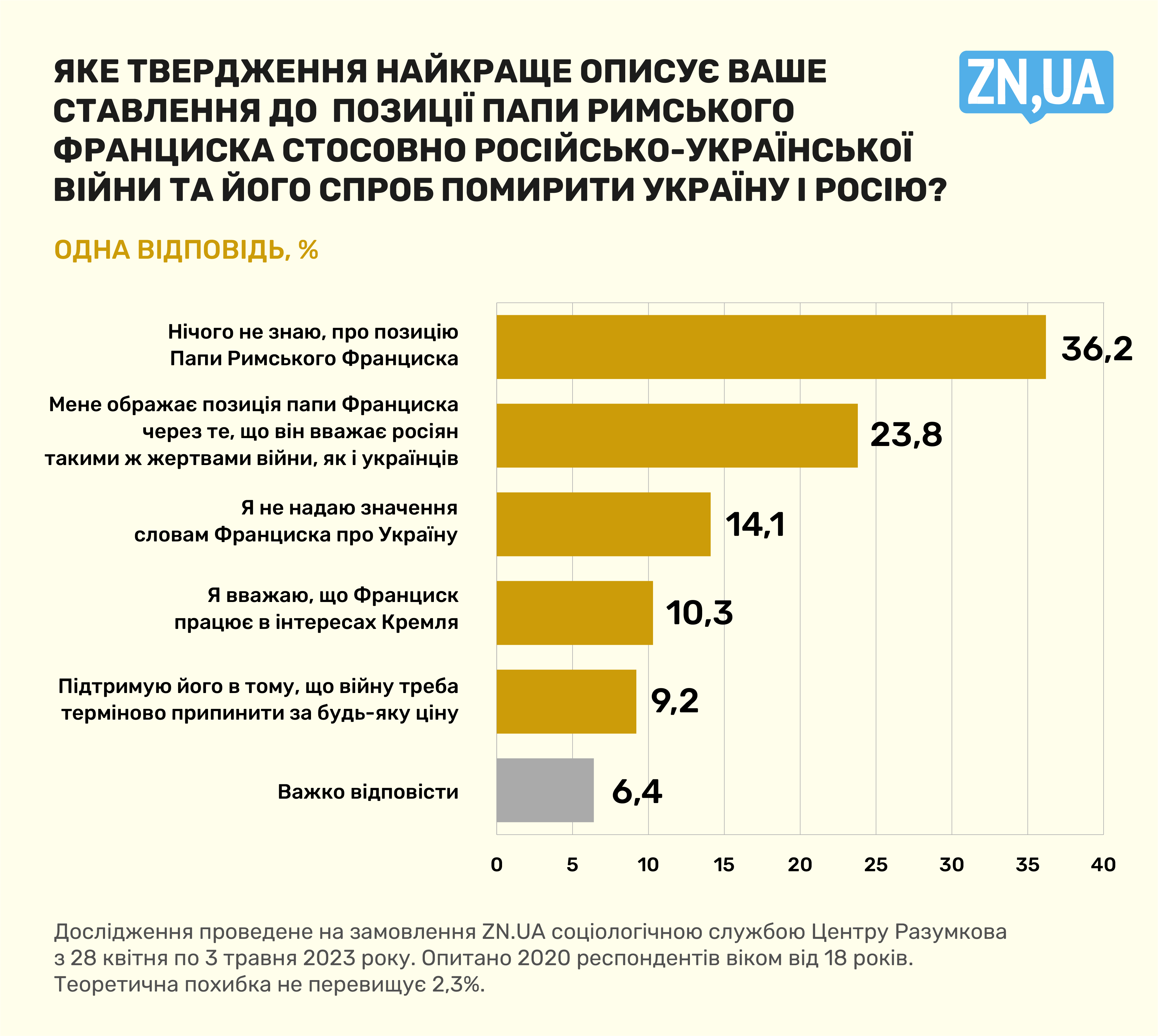 В целом негативно оценивает позицию Папы относительно российско-украинской войны около 34% украинцев: 23.8% возмущены тем, что папа Франциск сравнивает россиян и украинцев, считая их в равной степени "жертвами войны", а еще 10,3% считают, что понтифик "работает в пользу Кремля".