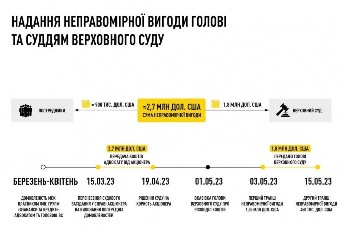 Неправомерная выгода в размере около 2,7 млн долларов США для главы Верховного Суда и адвоката может быть частью более широкой схемы коррупционного давления на суды, считают в НАБУ и САП.