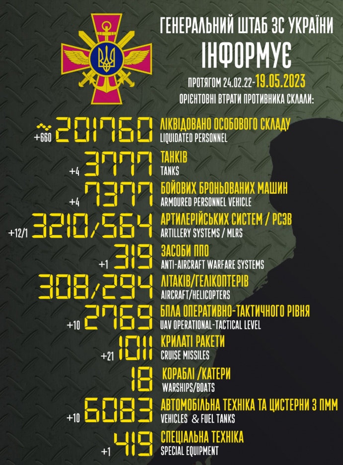 Детали: Общие боевые потери противника с 24.02.22 по 19.05.23 ориентировочно составили:
