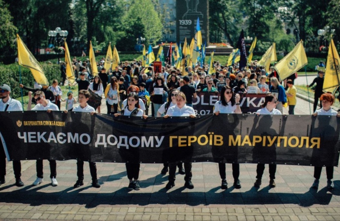 Через год после выхода защитников Мариуполя с "Азовстали" в Киеве состоялось шествие "Ждем домой героев Мариуполя". Родственники пленных, без вести пропавших и погибших военных прошли от парка Шевченко до Майдана Независимости.