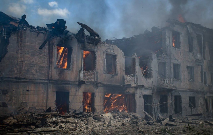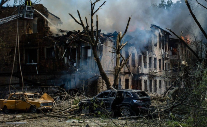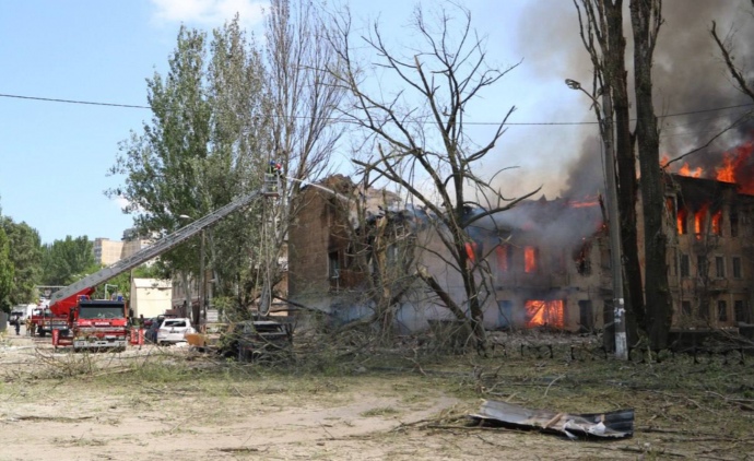 В ГСЧС сообщили, что в результате ракетного удара в городе произошло частичное разрушение трехэтажного здания медицинского учреждения с последующим горением, а также пожар в рядом расположенном здании.