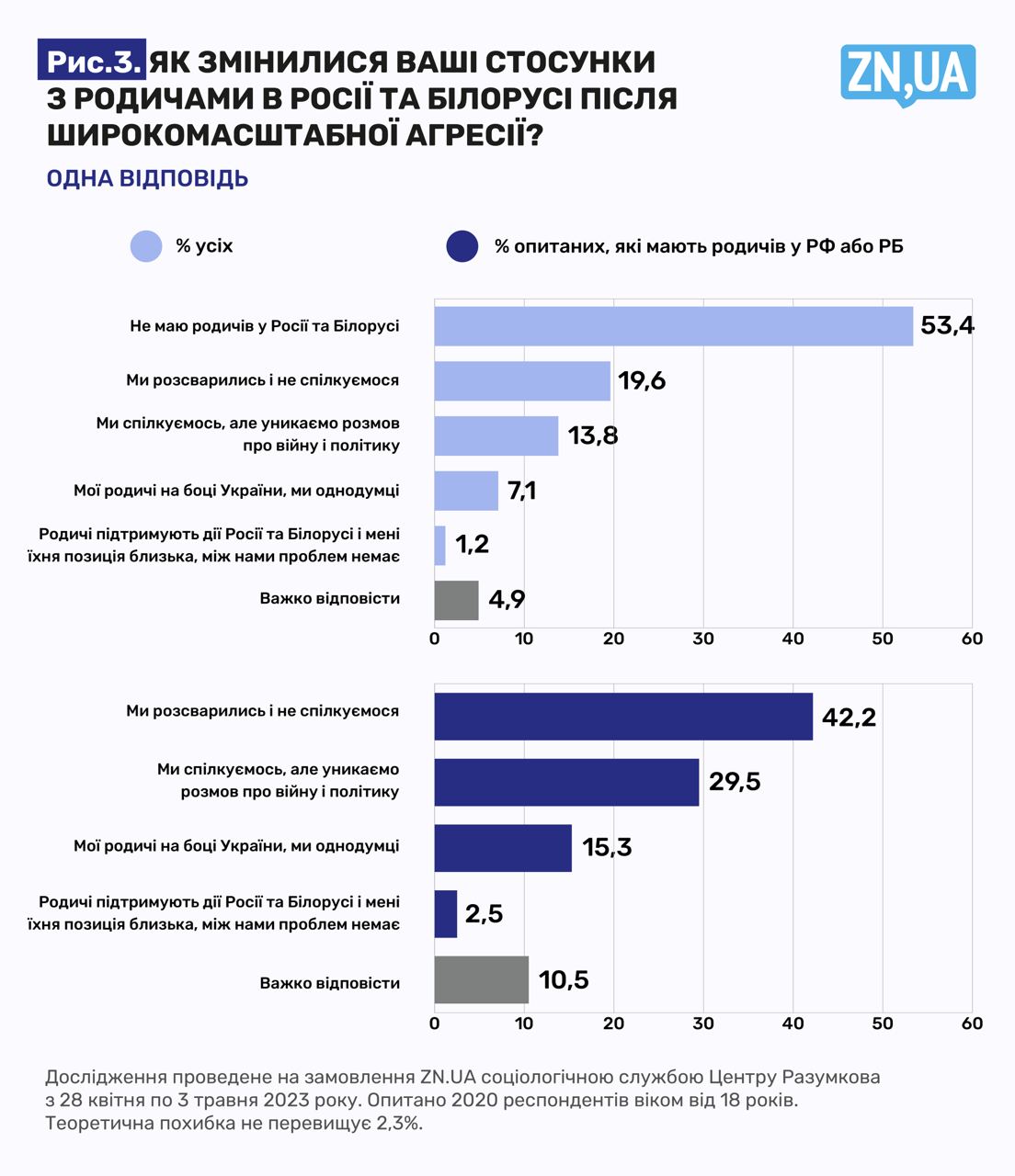 Согласно данным исследования, около половины респондентов (46,6%) имеют родственников в РФ или Беларуси. Однако 42,2% из них на вопрос "Как изменились ваши отношения с родственниками в России и Беларуси?" выбрали ответ "Мы поссорились и не общаемся", а почти каждый третий (29,5%) выбрал вариант "Мы общаемся, но избегаем разговоров о войне и политике".