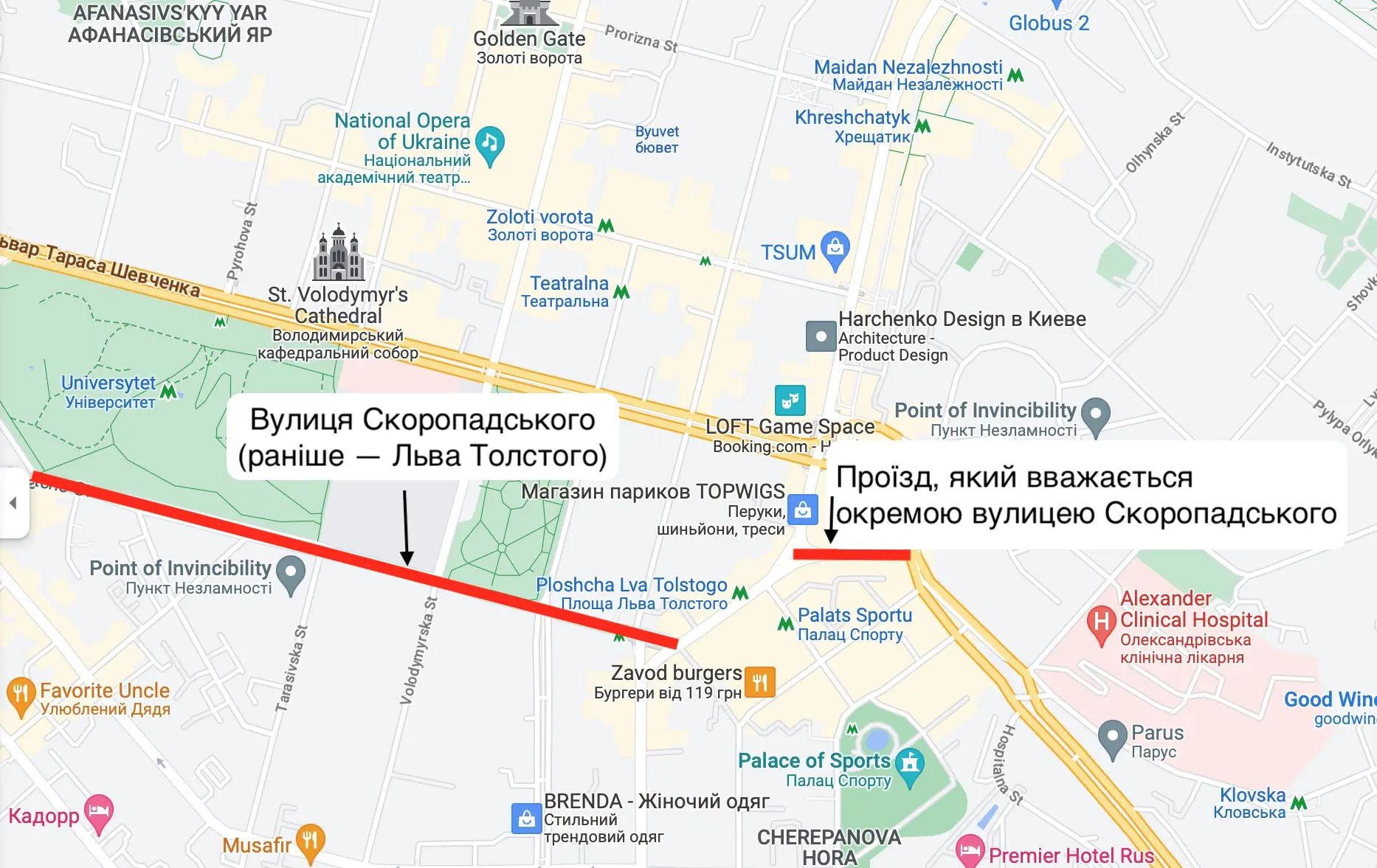 А 23 марта 2023 года улица Льва Толстого, которая брала начало от одноименной площади и пролегала в Голосеевском, Соломенском и Шевченковском районах, была переименована в улицу Гетмана Павла Скоропадского.