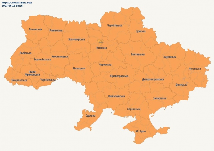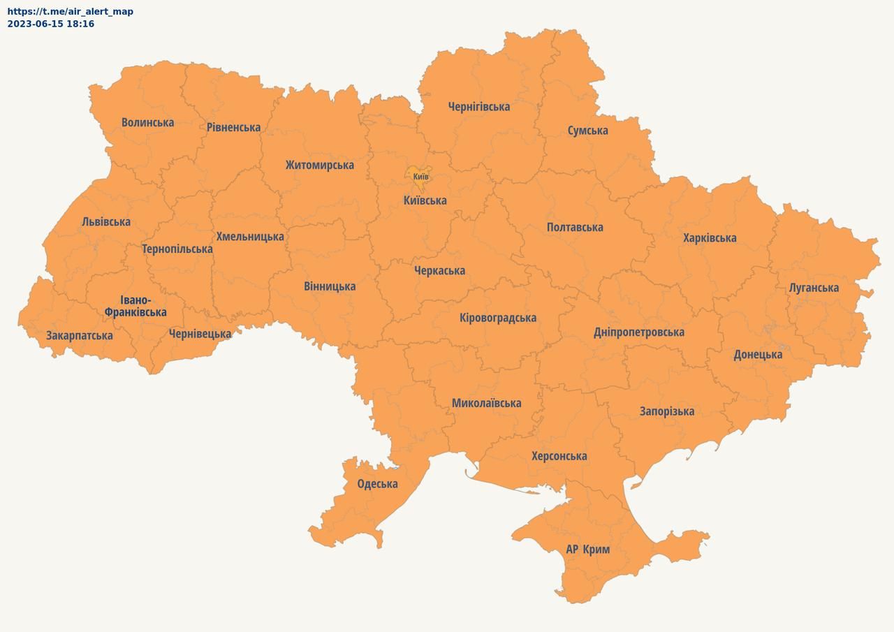 По состоянию на 18:16 четверга 15 июня во всех областях Украины была объявлена воздушная тревога. Она длилась от 16-ти до 42 минут в разных областях.