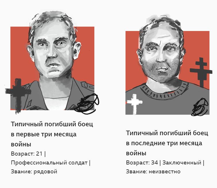 Если в первые три месяца войны типичный погибший – профессиональный солдат-контрактник 20 с небольшим лет, то в последние месяцы типичный российский боец, убитый в Украине, – 34-летний заключённый, отправившийся на фронт из колонии.