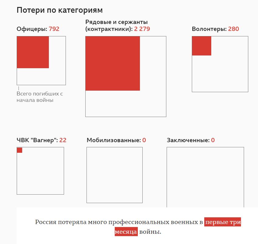 В целом в начале войны Россия потеряла больше профессиональных военных, а в последние месяцы – непрофессиональных.
