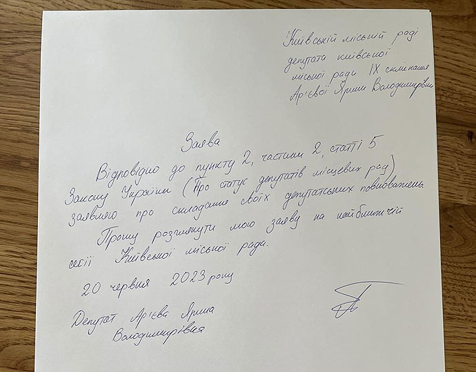 Прямая речь Арьевой: "Приняла решение сложить мандат депутата Киевсовета. Написала соответствующее заявление. Выполнять свои обязанности в этих условиях невозможно − суд ухудшил меру пресечения, несмотря на то, что я ни разу не нарушила предыдущую меру пресечения".
