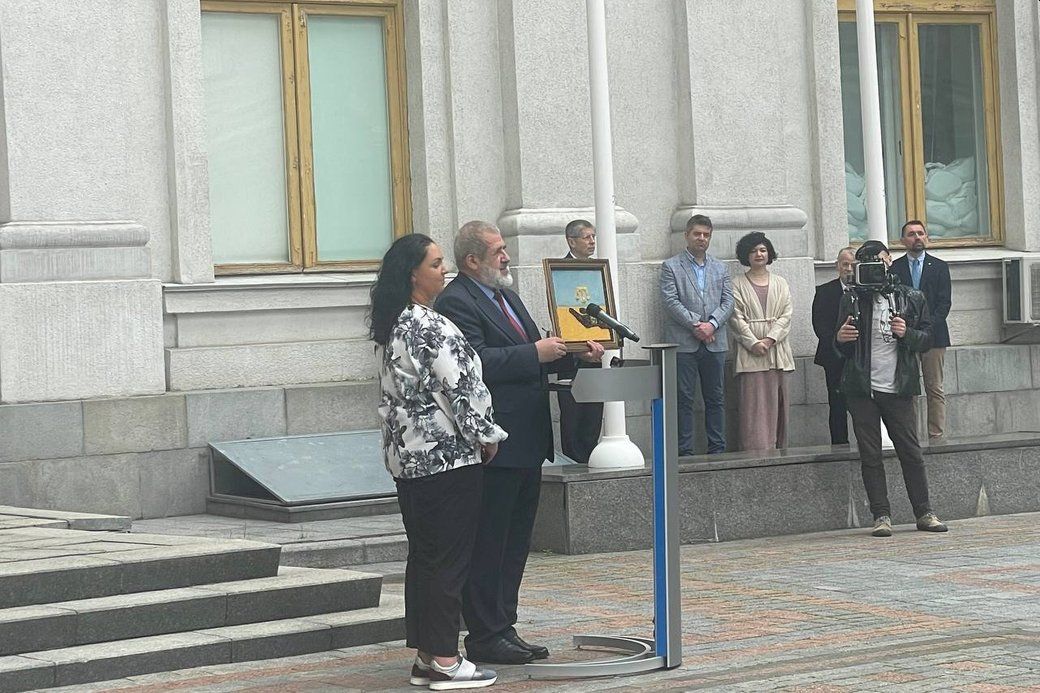 Детали: Во время чествования у Министерства иностранных дел Украины жительница Ровно подарила Рефату Чубарову картину с крымскотатарским флагом.