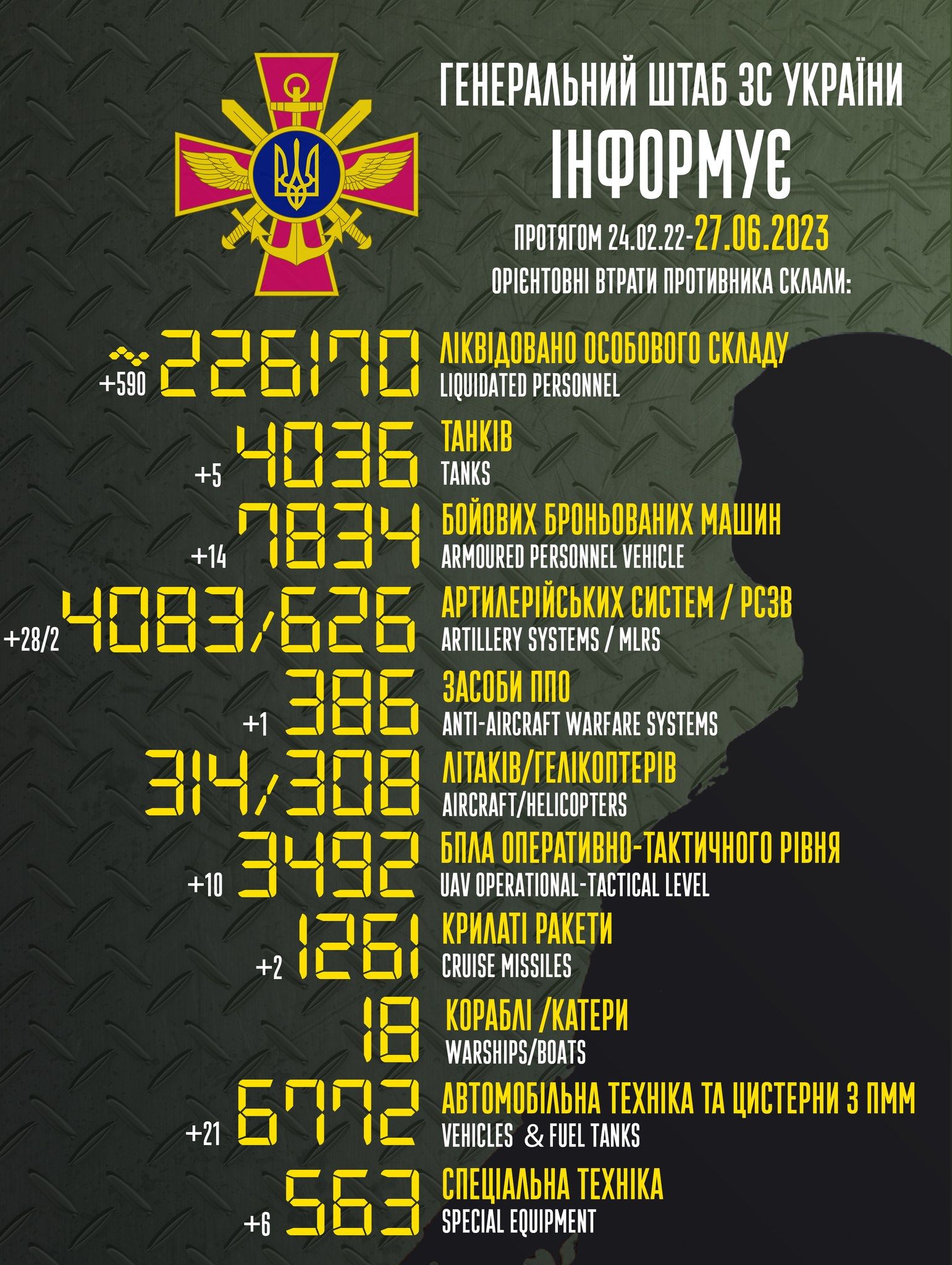Детали: По данным украинского Генштаба, общие боевые потери Российской Федерации с 24.02.22 по 27.06.23 ориентировочно составили: