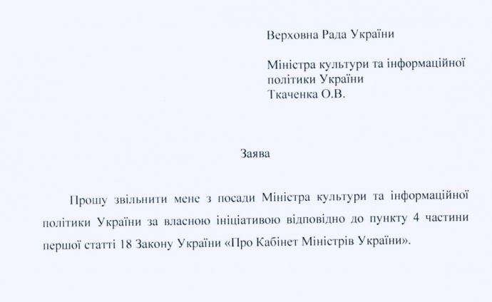 Верховная Рада уже получила заявление на увольнение с должности министра культуры и информационной политики Александра Ткаченко, и рассмотрит его на ближайшем пленарном заседании парламента.