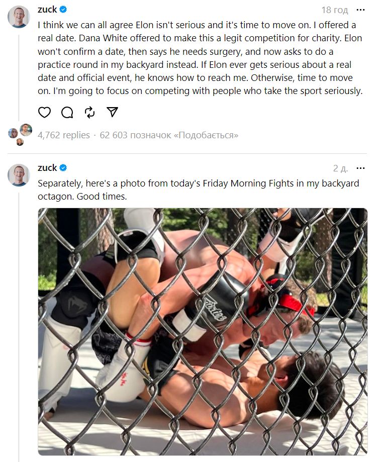 Цукерберг о "бое в клетке": Маск несерьезен, пора двигаться дальше