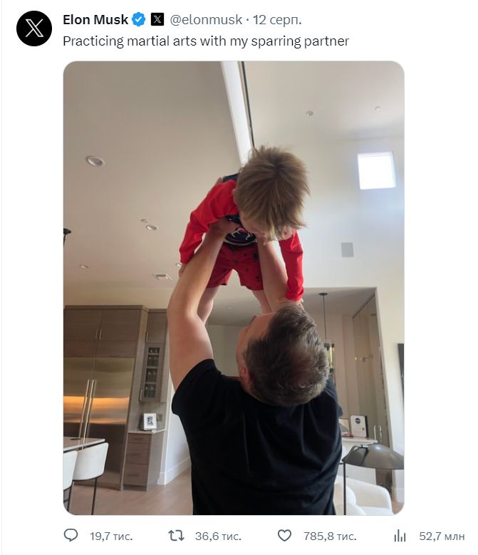 На прошлой неделе Маск показал, как он поднимает гантели в офисе, а затем – как подбрасывает ребенка вверх, написав: "Занимаюсь боевыми искусствами со своим спарринг-партнером".