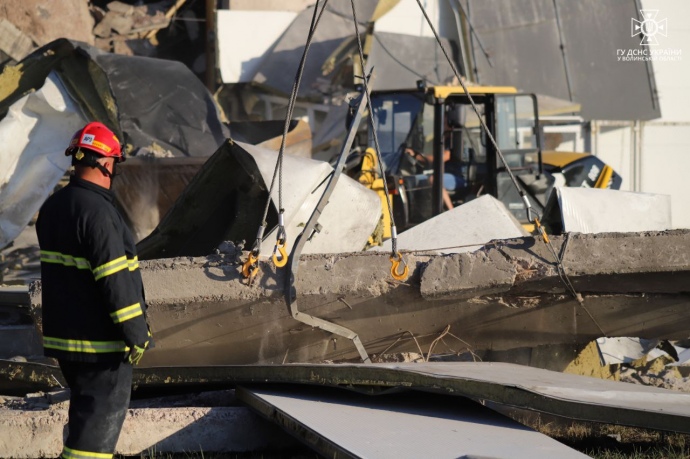 Дословно служба: "На Волыни спасатели ликвидировали последствия вражеского обстрела. Утром 15 августа под вражеский обстрел попало производственное предприятие в Луцке. В результате произошло разрушение конструкций и возник пожар. Из-под завалов спасатели деблокировали одного пострадавшего и изъяли тела еще трех погибших".