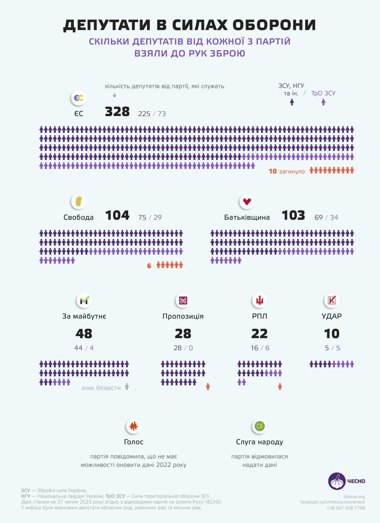 Детали: Сообщается, что наибольший процент депутатов-фронтовиков на местном уровне имеет "Радикальная партия" (22 военнослужащих среди 71 депутата, что составляет 31% от общего количества депутатов советов, которые исследуются), на втором месте "Свобода" (102 из 402 депутатов, которые имеют мандаты в городских, областных и районных советах, сейчас проходят службу − это 25,6%), а на третьем − "Европейская Солидарность" (служат 328, или 13,7% местных депутатов уровня городских, областных и районных советов).
