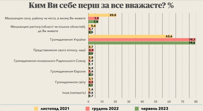 Детали: Кроме того, после широкомасштабного вторжения в Украине повысился показатель гражданской идентичности - 75-80%.