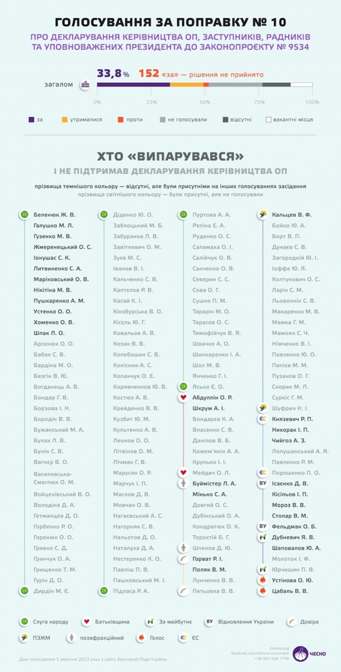 Почти 40% представителей монобольшинства во главе с Арахамией якобы "отсутствовали" или "не голосовали" при подтверждении поправки об открытии реестра деклараций. В то же время эти нардепы голосовали "за" рассмотрение других вопросов повестки дня на заседании парламента 5 сентября или же их карточка находилась в слоте.