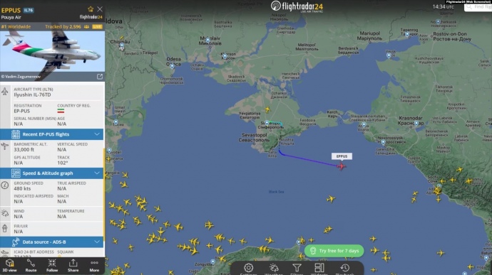 В оккупированном Россией Крыму из закрытого аэропорта Симферополя вылетел иранский транспортный самолет ИЛ-76ТД, принадлежащий авиакомпании Pouya Air.