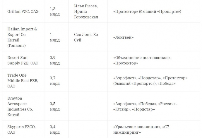 Больше всего деталей продала в Россию дубайская компания Ats Heavy Equipment & Machinery. За год с небольшим она сделала более 700 поставок на более чем 40 млн долларов. В основном запчасти для Boeing и Airbus достались группе "Аэрофлот", в которую, кроме собственно "Аэрофлота", входят компании "Россия" и "Победа".