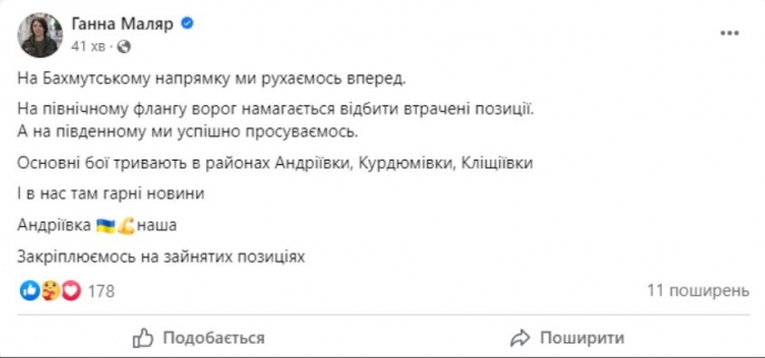 Заместитель министра обороны Анна Маляр заявила, что Силы обороны на Бахмутском направлении освободили населенный пункт Андреевка, командование 3-й отдельной штурмовой бригады официально опровергло эту информацию, назвав ее ложной и преждевременной.