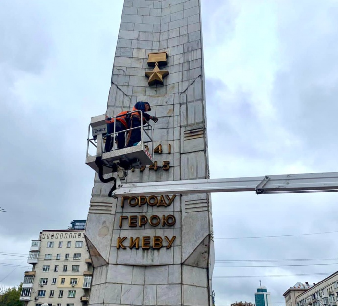 В Киеве демонтировали советскую символику и убрали аннотационную доску на русском языке с обелиска "Город-герой Киев" на бывшей площади Победы (ныне Галицкая площадь).