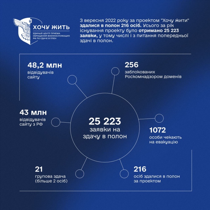 Справка: "Хочу жить" - государственный проект, призванный помочь военным армии РФ и Беларуси безопасно сдаться в плен. Проект был запущен в сентябре 2022 года Координационным штабом по вопросам обращения с военнопленными, действующим при поддержке Министерства обороны Украины и Главного управления разведки.