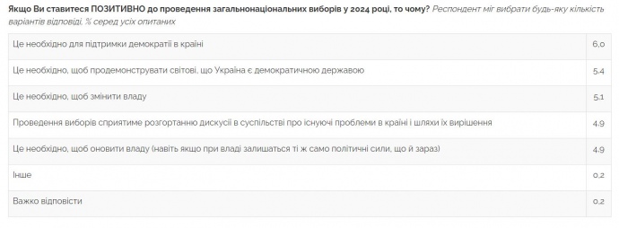 Детали: Респонденты считают, что выборы необходимы для поддержания демократии в стране (так считают 6% всех опрошенных), тем, что это необходимо, чтобы продемонстрировать миру, что Украина является демократическим государством (5%), необходимостью сменить власть (5%) или, по крайней мере, ее обновить (даже если у власти останутся те же политические силы, что и сейчас) (5%), тем, что проведение выборов будет способствовать развертыванию дискуссии в обществе о существующих проблемах в стране и путях их решения (5%).
