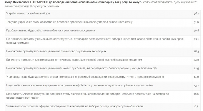 Негативное отношение к проведению выборов во время войны чаще всего обосновывается тем, что в стране нет денег на выборы (так считают 36% всех опрошенных), тем, что украинское законодательство не позволяет проведение выборов в период действия военного положения (32%), будет проблематично обеспечить безопасность участникам голосования (31%).