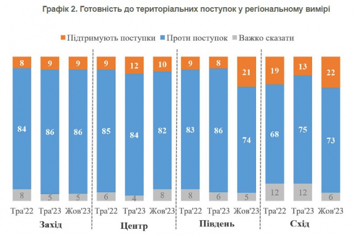 "Причем, если анализировать жителей Востока, которые и сейчас проживают на Востоке, то среди них 28% готовы к территориальным уступкам. Впрочем, несмотря на указанные тенденции для жителей Юга и Востока, среди них все равно убедительное большинство (74% на Юге и 73% на Востоке) выступают против каких-либо территориальных уступок", − отмечают социологи.