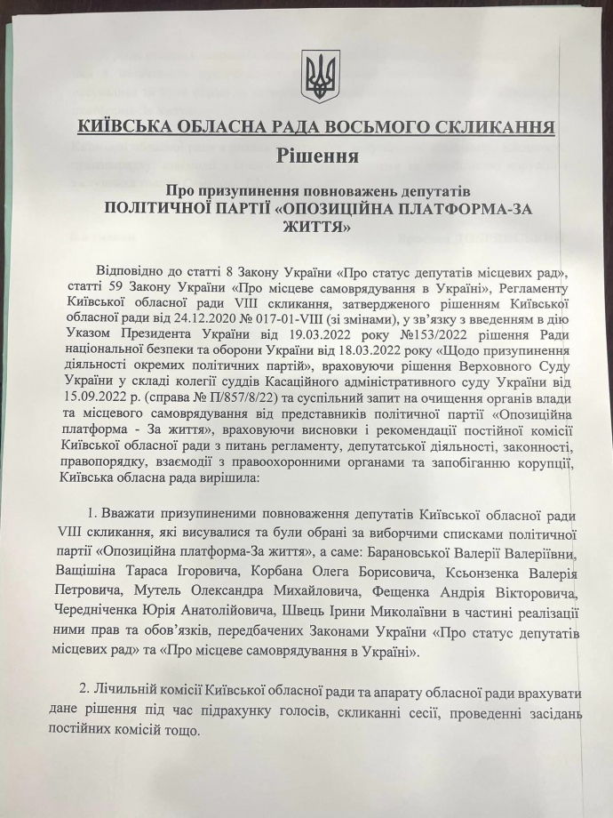 Киевский областной совет принял решение о приостановлении полномочий депутатов, которые были избраны по спискам запрещенной в Украине пророссийской партии ОПЗЖ.