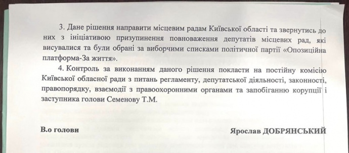 Прямая речь Тытыкало: "Только что Киевский областной совет поддержал мой проект решения, поданный по инициативе фракции "Европейская Солидарность Киевщины" "О приостановлении полномочий депутатов политической партии "Оппозиционная платформа − За жизнь", которым решено приостановить полномочия депутатов Киевского областного совета VIII созыва, которые выдвигались и были избраны по избирательным спискам политической партии "Оппозиционная платформа − За жизнь"".
