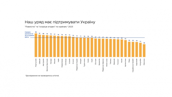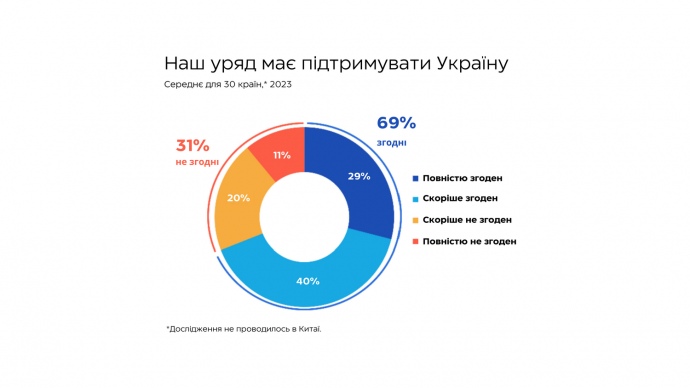 Детали: По данным опроса, в среднем 29% опрошенных в этих странах "полностью согласны" с тем, что их правительства должны поддерживать Украину, которая защищается от российской агрессии, и еще 40% "скорее согласны" с этим.