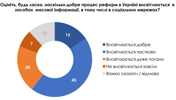 Детали: В то же время респонденты назвали недостаточным освещение реформ в медиа − только 15% считают, что процесс реформ хорошо освещается в медиа, еще 45% считают освещение частичным.