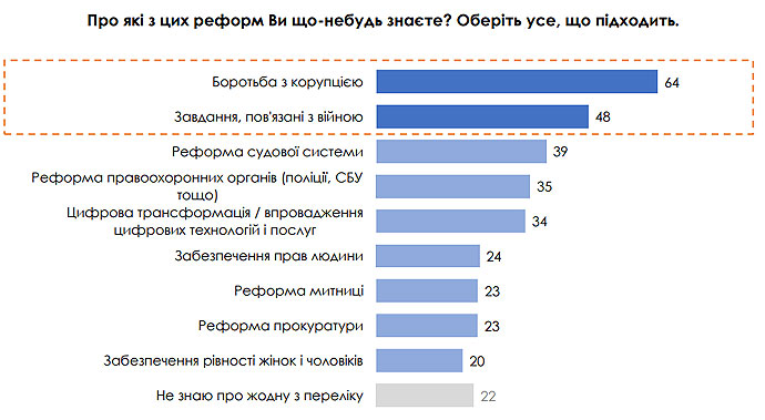 Украинцы говорят, что осведомленность об отдельных реформах и задачах также невысока.