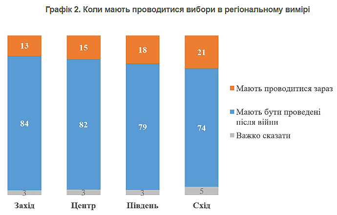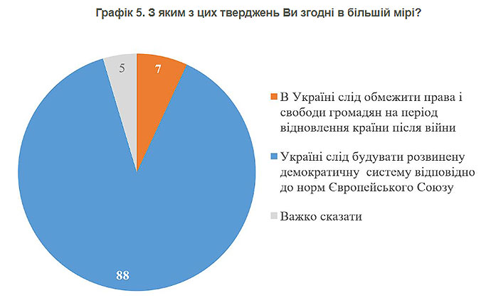 Хотя украинцы считают целесообразным отложить проведение выборов на период после войны, но при этом 88% настаивают, что в Украине должна строиться развитая демократическая система в соответствии с нормами Европейского Союза. За ограничение прав граждан на период восстановления после войны выступают лишь 7% респондентов.