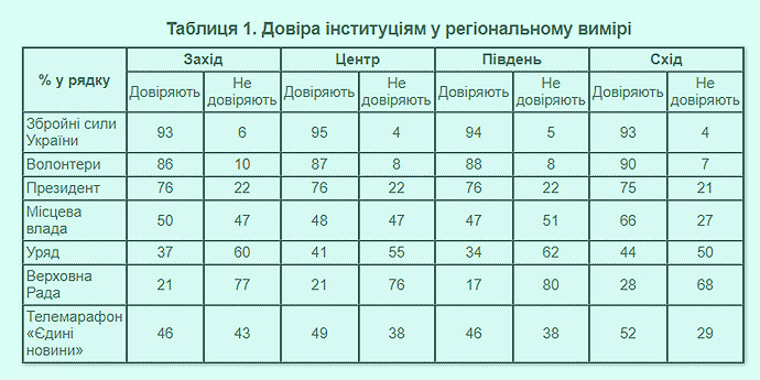 В КМИС отмечают, что во всех регионах абсолютное большинство населения доверяют Вооруженным силам, волонтерам и президенту. Доверие к другим институтам также примерно одинаково в разных регионах.