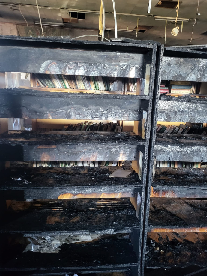 Детали: Отмечается, что попадание пришлось в окно гуманитарного отдела, в результате чего сгорели книги, потолок и пол.