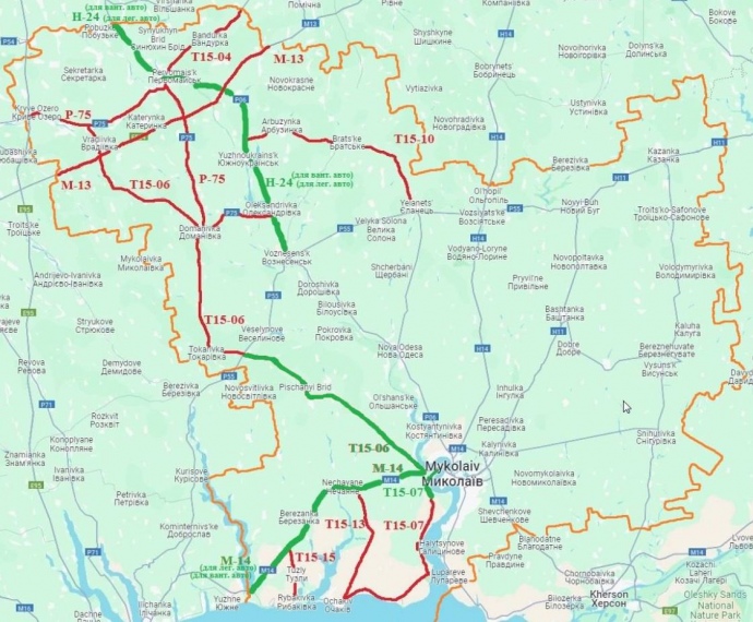 По Т-15-06 от Николаева до Березки и небольшой участок по Т-15-07 от Николаева до мкрн. Малая Корениха также открыты для всех видов транспорта".