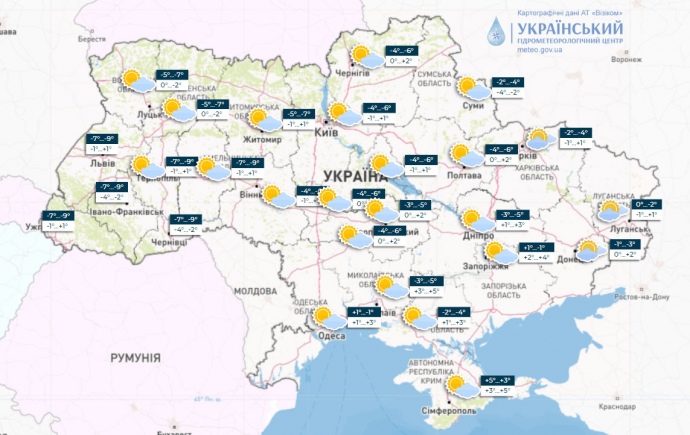 Дословно УГМЦ: "30 ноября преимущественно без осадков, лишь в северо-восточных областях ночью небольшой снег, на Закарпатье и Прикарпатье днем умеренный мокрый снег, местами налипание мокрого снега; на дорогах страны, кроме юго-востока, гололедица; температура ночью 3-8° мороза на западе страны до 11° мороза, в юго-восточной части страны около 0°, днем от 3° мороза до 3° тепла, на юге страны до 6° тепла".