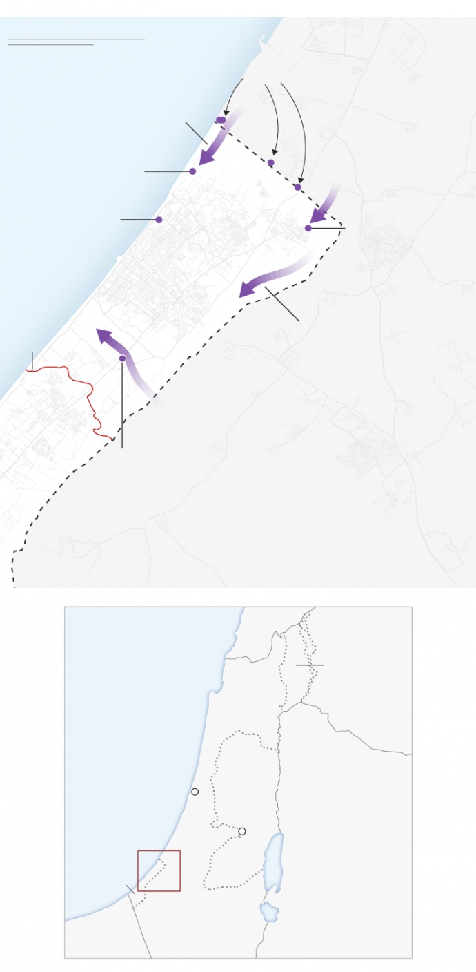 CNN проанализировала видеоматериалы, обнародованные ЦАХАЛ и ХАМАС, а также спутниковые снимки и видео из социальных сетей, которые показывают, что войска окружили город с трех направлений: от северо-западной границы Газы вдоль побережья Средиземного моря, с северо-востока у Бейт-Хануна и с востока на юг от города Газа, приближаясь к морю.