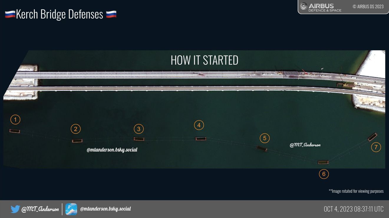 Этому предшествовало: Россия установила цепочку барж на подступах к Крымскому мосту, чтобы защитить его от атак украинских морских беспилотных катеров.